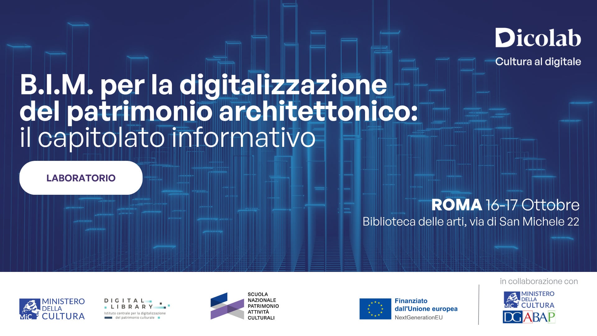 Il corso è parte dell'offerta formativa Dicolab. Cultura al digitale, un'iniziativa del Ministero della Cultura, Digital Library, Scuola Nazionale del patrimonio e delle attività culturali, finanziato da Next generation EU.